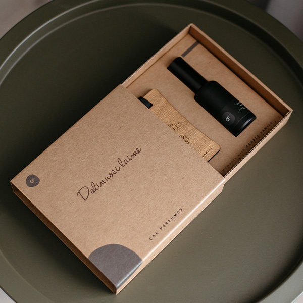 Rinkinyje rasite aromatinę kortelę ir to paties kvapo purškiklį, kuriuo galėsite įkvėpinti aromatinę kortelę, arba naudoti, kaip automobilio salono ar patalpų gaiviklį.